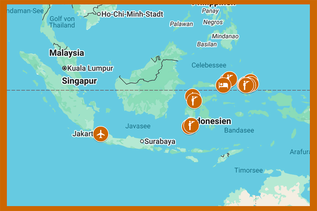 Der Reiseverlauf führt durch zwei der ornithologisch bedeutendsten Regionen Indonesiens: die Molukken (Halmahera) sowie die Insel Sulawesi. Beide Regionen zeichnen sich durch einen außergewöhnlich hohen Anteil an Endemiten aus, der weltweit seinesgleichen sucht. Viele der hier vorkommenden Arten sind auf einzelne Inseln oder Inselgruppen beschränkt und stellen für Vogelbeobachter absolute Zielarten dar. Die Reise ist entsprechend so aufgebaut, dass ausreichend Zeit an den jeweils besten Beobachtungsplätzen zur Verfügung steht und wichtige Gebiete mehrfach aufgesucht werden können.