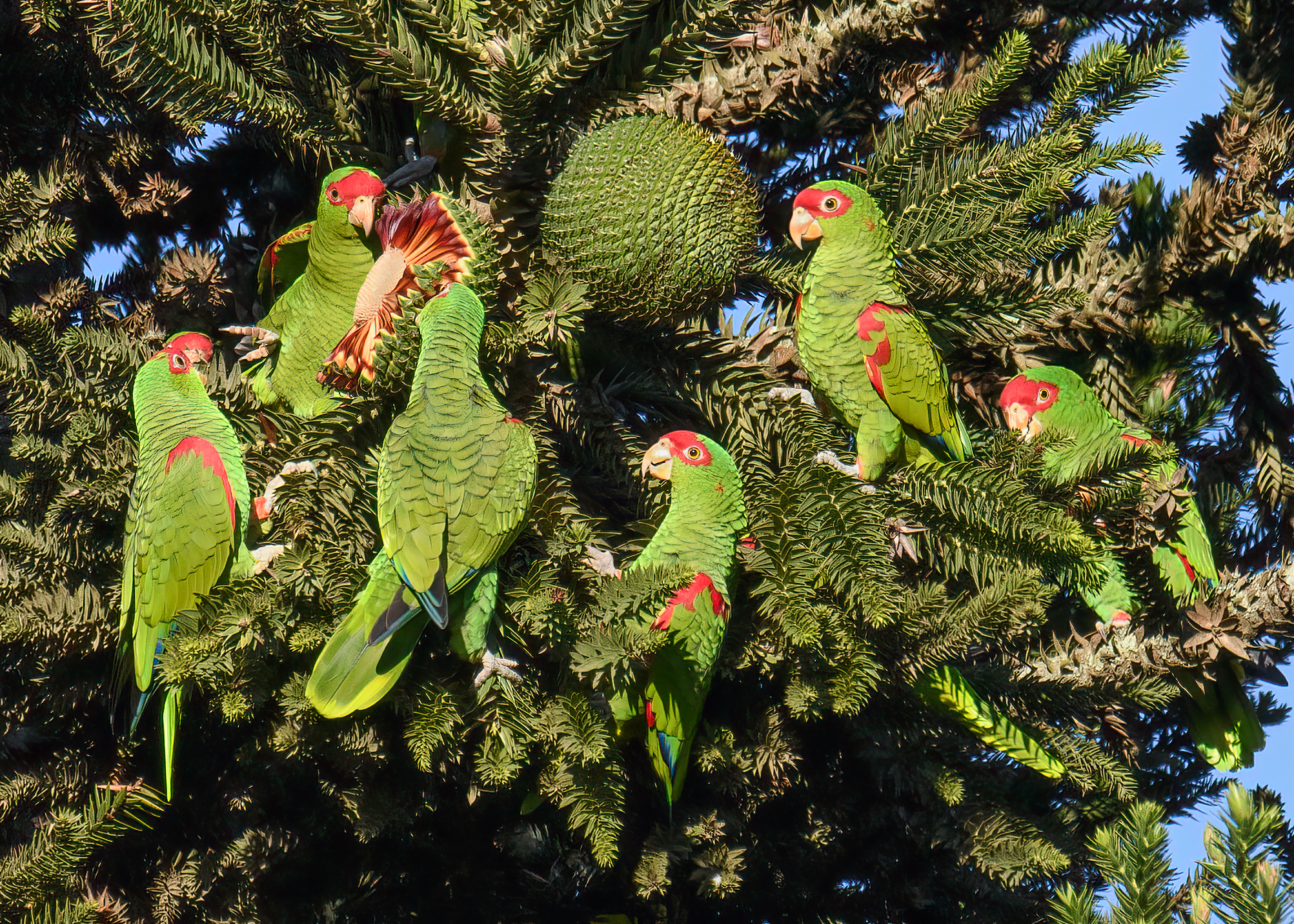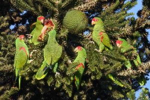 Titelfoto: Gruppe Prachtamazonen in Araukarie. Foto: Adrian Rupp.